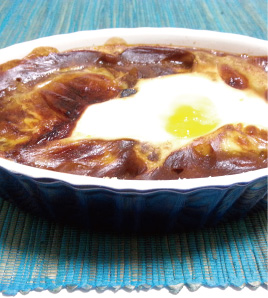 にとろけるチーズをのせ、卵をのせ、余熱したオーブンで焼き色がつくまで焼く。 |