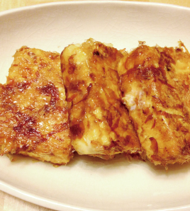 片栗粉→とき卵→かつお節の順につけ、熱したフライパンに油をひき、カリッとなるまで焼いたら出来上がり♪ |