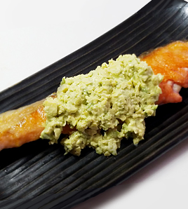 アボカドは皮をむき、種を取り、ボウルにうつしスプーンでつぶす。 |