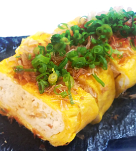 食べやすい大きさに切り、ネギ、かつお節をトッピングし、しょうゆをかける。 |