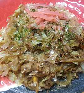 器に盛り、鰹節、青のり、紅しょうがをトッピングする。 |