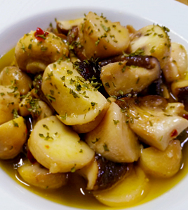 香りが出てきてオイルがふつふつしたら、きのこ類と塩を加え全体を混ぜる。 |