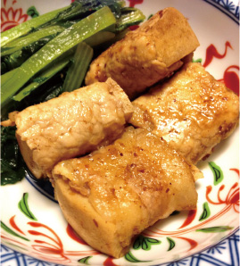 豚肉で高野豆腐を巻き、小麦粉をまぶします。 |