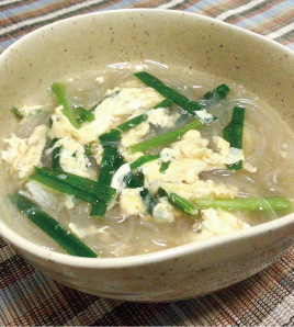 に、にらを加えひと煮たちしたら、溶き卵を回し入れ、ひと混ぜして火を止める。 |