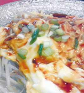 同じフライパンに溶いた卵を流しいれふわふわ感を残してもやしの上に盛り付け。 |