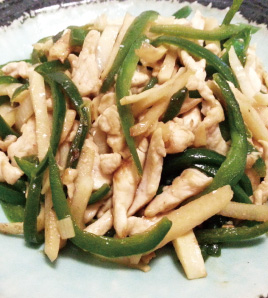 ピーマンは縦に細く切る。たけのこは千切りに。 |