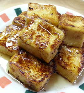 耐熱皿に牛乳と砂糖を入れて混ぜ、高野豆腐を浸してレンジで3分程加熱する。 |