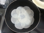 [1]フライパンに餃子の皮を並べ(写真参照)、ケチャップをぬる。