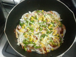 [2]切った具材を[1]にちらし、チーズをのせてフタをして弱火で加熱する。