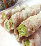 [2]オクラに豚肉を巻きつけ、塩こしょうをふる。