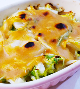 グラタン皿に の白菜を入れ、 をかける。 |