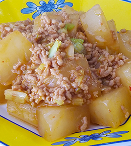 フライパンにごま油小1とにんにく、生姜のみじん切りを入れ炒める。香りがたったら、ひき肉を加え中火で炒める。ひき肉の色が変わったら、大根を加えて炒める。 |