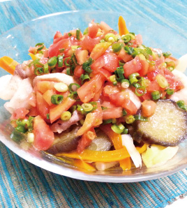 トマトをサイコロ状にカットしたものと、刻んだネギと☆を混ぜてタレを作る。 |