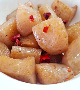 こんにゃくはスプーンでカットし、熱湯で1分程茹で アク抜きをする。 |