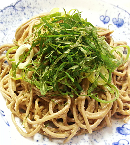 器に盛り、ねぎ、刻んだ大葉をのせる。 |