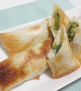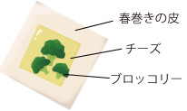 春巻きの皮の上にチーズ、ブロッコリー、をのせ巻く。(図参照)![]() |