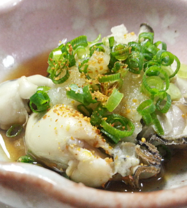 器に牡蠣を盛り、大根おろし、きざみねぎ、ポン酢をかけて 食べる。七味はお好みで。 |