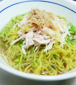 湯を沸かしてめんを入れ、ゆで上がりにレタスを加えてひとまぜ。ざるに上げて の器に盛る。 |