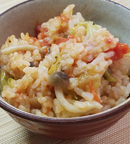 にシーチキンを汁ごと加え、 とトマトをのせて炊く。 |