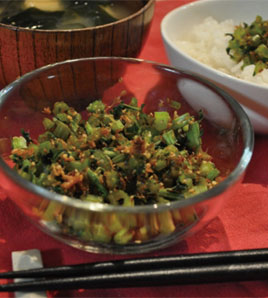 大根の葉を細かくみじん切りにし、 フライパンに葉と塩少々を入れ中火で炒める。 |