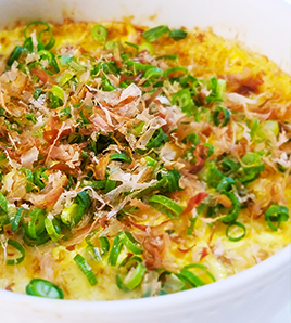 刻みネギ、かつお節をトッピングし、お好みでしょうゆをたらして食べる。 |