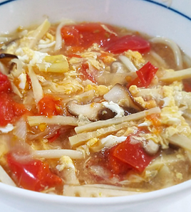 しいたけは石付きを取り薄切りに。たけのこは千切りに。トマトはヘタを取りざく切りに。長ねぎは斜め薄切りに。 |